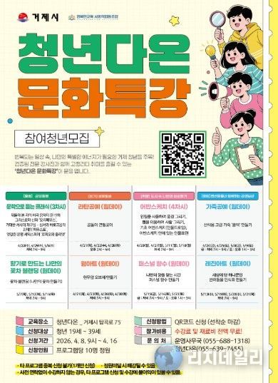 리치데일리 김상현 기자 | 거제시는 청년문화공간 ‘청년다온(거제시 탑곡로 75)’에서 지역 청년들의 여가활동 지원과 문화 향유 기회 확대를 위한 '2026년 청년다온 문화특강' 수강생을 모집한다고 밝혔다.