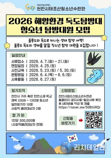 리치데일리 김상현 기자 | 천안시청소년재단 산하 천안시태조산청소년수련관은 지역 청소년을 대상으로 ‘2026 해양환경 독도탐방대’ 참가자를 모집한다고 7일 밝혔다.