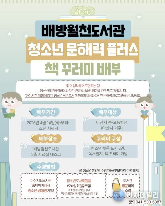 오는 14일부터 ‘아산시 한 책 함께 읽기’ 청소년 부문 도서를 포함한 ‘책 꾸러미 배부’를 진행한다. 책 꾸러미는 청소년 대상 도서 2권과 독서일지, 책 꾸러미 가방으로 구성되어, 독서 활동을 기록하고 지속적인 독서 습관 형성을 돕는다.