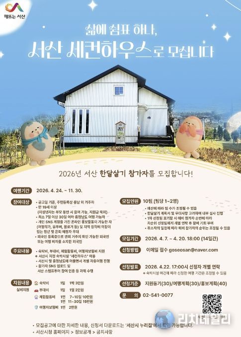 리치데일리 김상현 기자 | 충남 서산시가 오는 4월 20일까지 ‘서산 한 달 살기’ 참가팀을 모집한다.