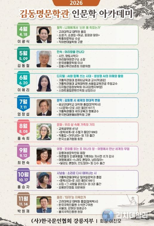 이어 18일에는 강릉문인협회의 주관으로 진행하는 시민 참여형 프로그램인 ‘인문학 아카데미’가 문을 연다.