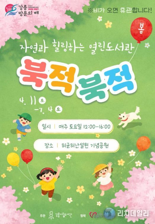 리치데일리 김상현 기자 | 강릉시립도서관은 다가오는 따뜻한 봄을 맞아 오는 11일부터 7월 4일까지 허균허난설헌 기념공원에서 ‘자연과 힐링하는 열린도서관 북적북적’ 봄 시즌을 운영한다고 밝혔다.