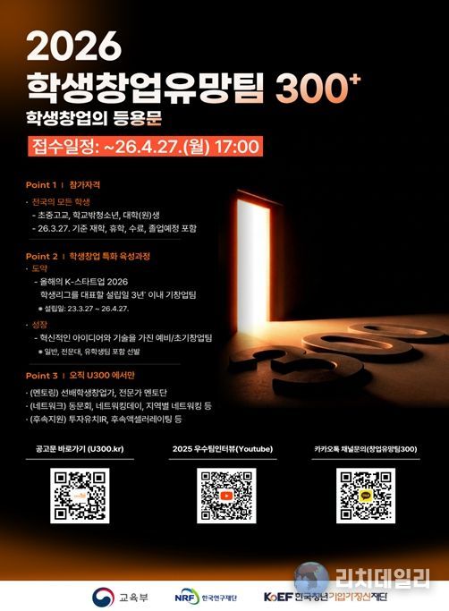 리치데일리 김상현 기자 | 교육부와 한국청년기업가정신재단(이사장 한정화)은 '2026 학생 창업유망팀 300+' 참가팀을 4월 8일부터 4월 27일까지 모집한다.