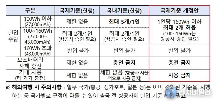 기존 국제기준에서는 일반인이 가장 많이 사용하는 100Wh(27,000mAh) 이하 보조배터리에 대한 반입 수량 제한이 없어, 국내 기준을 마련하여 1인당 5개까지 제한했으나, 앞으로는 신설된 국제기준에 따라 보조배터리(Power bank)는 1인당 최대 2개(160Wh/43,000mAh 이하)로 반입이 제한된다.