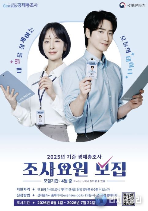 모집 분야와 인원은 ▲총관리자 1명 ▲스마트조사관리자 2명 ▲조사관리자 28명 ▲조사지원담당자 6명 ▲조사원 145명 등이다. 만 18세 이상의 책임감이 투철하고 계약 기간 중 업무에 전념할 수 있는 자로, 경제총조사, 사업체조사, 광업제조업조사 등 통계조사 경험자는 우대한다.