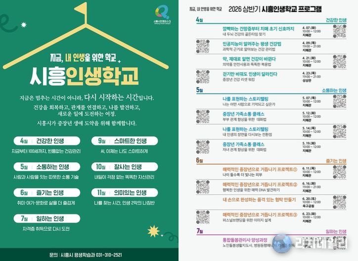 김상동 평생교육원장은 “시흥인생학교는 중장년의 삶 전반을 체계적으로 지원하는 통합형 인생 설계 플랫폼”이라며 “건강 회복에서 시작해 관계 확장, 새로운 도전과 성찰로 이어지는 여정을 통해 중장년 시민들이 스스로 삶의 방향을 설계할 수 있도록 적극 지원하겠다”라고 밝혔다.