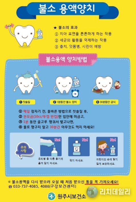 리치데일리 김상현 기자 | 원주시보건소는 시민의 구강 건강 증진과 충치 예방을 위해 ‘불소용액 양치(가글) 사업’을 개인 및 기관(단체)을 대상으로 추진한다.