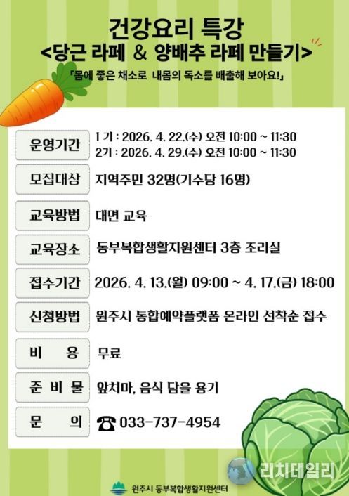 리치데일리 김상현 기자 | 원주시 동부복합생활지원센터는 오는 13일부터 ‘당근 라페·양배추 라페 만들기’ 건강 요리 특강 참여자를 모집한다.
