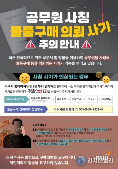 리치데일리 김상현 기자 | 파주시는 최근 전국적으로 확산 중인 공무원 사칭 사기 전화(보이스 피싱) 및 공문서 위조를 동반한 물품구매 사기 시도가 지속적으로 발생함에 따라, 관내 납품업체와 시민 피해 예방을 위해 각별한 주의를 당부했다.