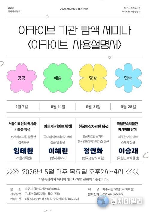 리치데일리 김상현 기자 | 파주시 중앙도서관은 오는 5월 7일부터 5월 28일까지 매주 목요일 중앙도서관 501호에서 기록보관기관 탐색 강좌 ‘아카이브 사용설명서’를 운영한다.