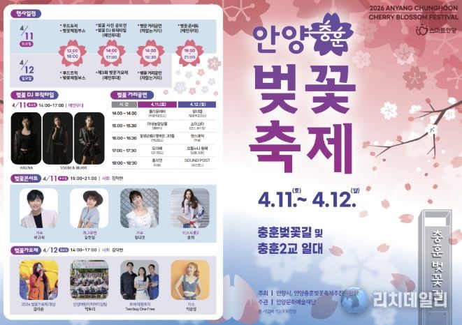 리치데일리 김상현 기자 | 안양시는 오는 4월 11일부터 12일까지 이틀간 만안구 충훈동 충훈벚꽃길과 충훈2교 하부, 석수로 일대에서 ‘2026 안양충훈벚꽃축제’를 개최한다고 8일 밝혔다.