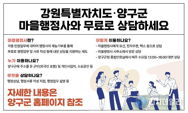 마을행정사는 행정사의 재능기부를 통해 복잡한 행정 업무 및 서류 작성 등에 대해 무료로 상담을 지원하는 제도로, 양구군에 주소를 둔 군민은 물론 외국인, 개인사업자, 소상공인 등 행정 상담이 필요한 사람이라면 누구나 이용할 수 있다.