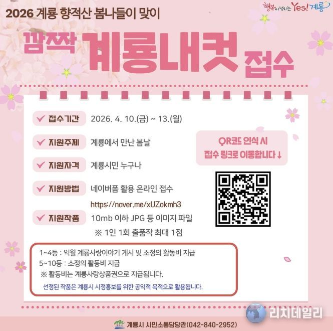 시 관계자는 “시민이 직접 기록한 계룡의 봄이 또 하나의 소중한 지역 이야기로 남길 기대한다”며 “시민 여러분의 많은 관심과 참여를 바란다”고 말했다.