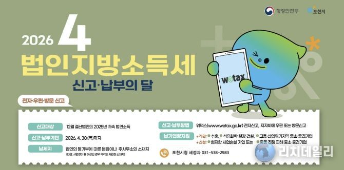 리치데일리 김상현 기자 | 포천시는 법인지방소득세 신고·납부 기한이 다가옴에 따라 오는 4월 30일까지 신고와 납부를 마쳐줄 것을 당부했다.