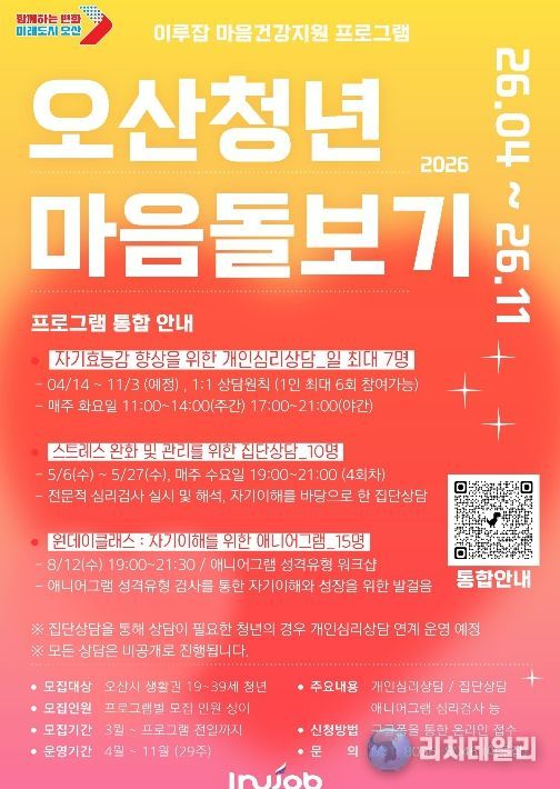 리치데일리 김상현 기자 | 오산시는 청년공간 ‘이루잡’이 지역 청년들의 정신건강 증진을 위해 ‘2026 오산청년 마음돌보기’ 프로그램을 오는 4월 14일부터 11월까지 운영한다고 밝혔다.