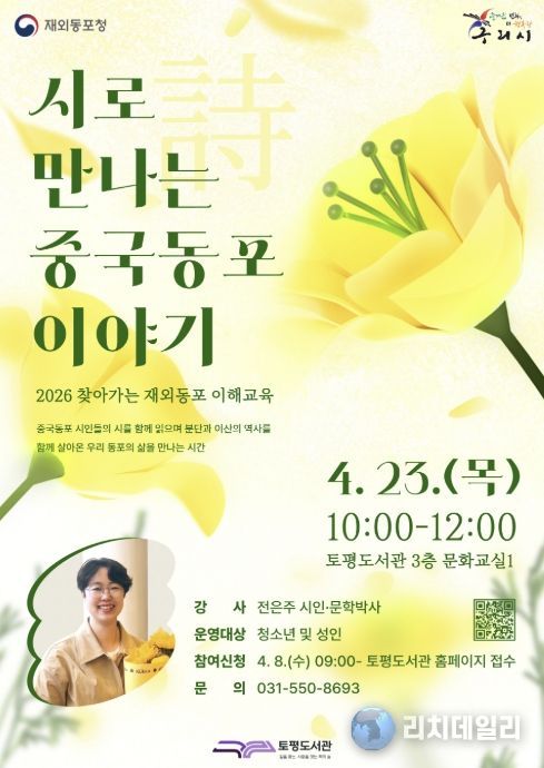 리치데일리 김상현 기자 | 구리시 토평도서관은 4월 8일부터 재외동포청이 주관하는 '찾아가는 재외동포 이해 교육 – 시로 만나는 중국동포 이야기' 참여자를 모집한다고 밝혔다.