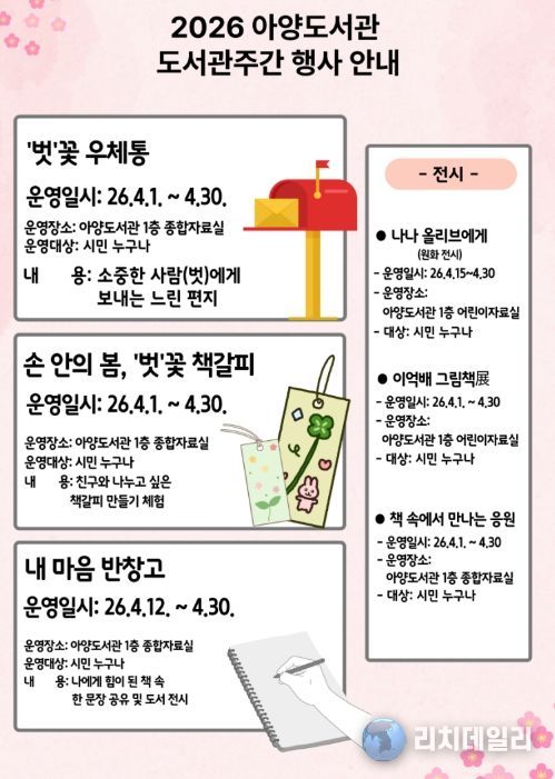 리치데일리 김상현 기자 | 안성시 아양도서관은 ‘2026년 도서관의 날’ 및 ‘도서관 주간’을 맞아 오는 4월 15일부터 25일까지 ‘연결고리’를 주제로 다채로운 행사를 운영한다.