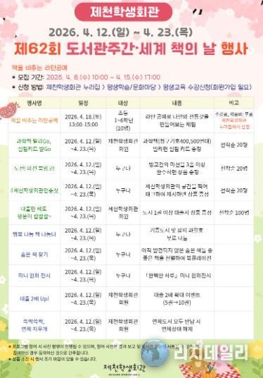 제천학생회관장은 “도서관주간을 맞아 누구나 부담 없이 도서관을 찾고, 책을 통해 새로운 즐거움과 경험을 얻는 시간이 되길 기대한다”며 “앞으로도 지역과 함께하는 열린 문화공간으로서 역할을 이어가겠다”고 밝혔다.