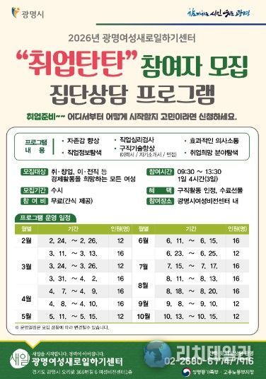 광명여성새로일하기센터는 취·창업과 이·전직을 희망하는 여성을 위해 ‘취업탄탄’ 집단상담 프로그램 참여자를 수시 모집하고 있다고 8일 밝혔다.