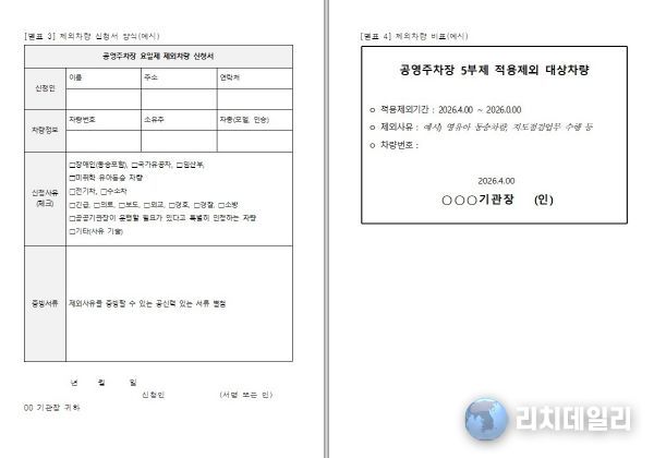 아울러 공단은 장애인·임산부 차량, 특수목적 차량, 전기차·수소차 등 불가피한 사유가 있는 경우를 고려하여 ‘공영주차장 요일제 제외차량 신청서’를 통해 제외차량을 운영할 계획이다. 해당 차량은 각 주차장 관리사무소에 방문하여 신청서를 작성하면, 내용 확인 후 ‘제외차량 비표’를 발급받아 이용할 수 있다.