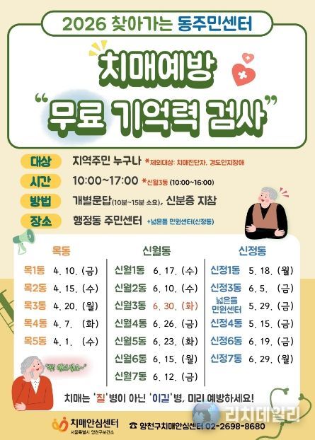 한편 지난해 양천구는 해당 사업을 통해 총 3,080명의 검사를 진행했으며, 이 중 194명의 인지 저하를 확인해 조기 관리 체계로 연계했다. 구는 ‘찾아가는 무료 기억력 검사’를 지속적으로 추진해 치매 예방률을 높이고, 생활 속 인지 건강관리도 적극 지원할 계획이다.