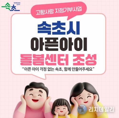 리치데일리 김상현 기자 | 속초시가 2026년 고향사랑기금 지정기부 1호 사업인 ‘아픈아이 돌봄센터 조성 사업’ 모금을 본격 추진하고, 기부 참여 확대를 위한 홍보 이벤트를 함께 진행한다.