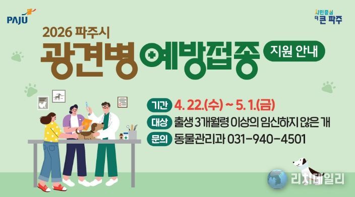 시는 광견병 예방 백신 7,000마리분을 무상 지원하며, 예방접종을 희망하는 반려견 보호자는 36개 지정 동물병원을 방문해 시술비 1만 원만 부담하면 접종이 가능하다. 참여 동물병원 목록은 파주시청 누리집에 게시된 공고문을 통해 확인할 수 있다.