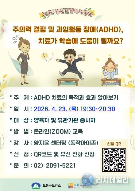 리치데일리 김상현 기자 | 서울 도봉구가 오는 4월 23일 오후 7시 30분 아동‧청소년 보호자와 관계 기관 종사자를 대상으로 주의력결핍 과잉행동장애(ADHD) 온라인 교육(ZOOM)을 진행한다.