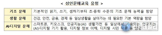 성인 문해교육 지원사업은 배움의 기회를 놓친 어르신 등에게 읽기·쓰기·셈하기 등 기초 문해 역량부터 건강, 안전, 금융 등 일상생활에 필요한 역량, 나아가 인공지능(AI)·디지털 활용 역량까지 함양할 수 있도록 지원하는 사업이다.