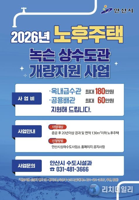 리치데일리 김상현 기자 | 안산시는 노후주택 상수도관에서 발생할 수 있는 녹물을 예방하고 안전하고 깨끗한 수돗물을 공급하기 위해 ‘녹물 없는 우리 집 수도관 개량 지원사업’을 추진한다고 9일 밝혔다.