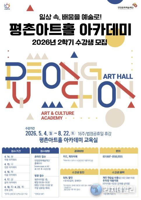 리치데일리 김상현 기자 | 안양문화예술재단은 시민 누구나 문화예술을 자유롭게 접하고 즐겁게 배울 수 있도록 오는 4월 14일부터 23일까지 ‘2026년 평촌아트홀 아카데미’ 2학기 수강생을 모집한다.