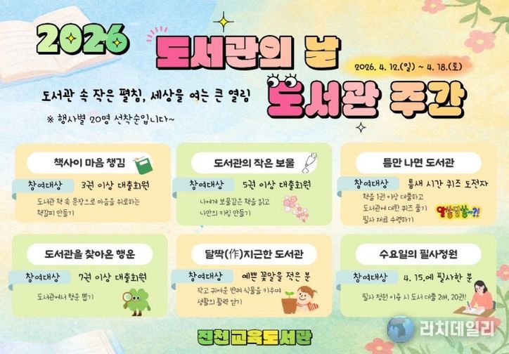 리치데일리 김상현 기자 | 진천교육도서관은 도서관의 날·도서관 주간을 맞이하여 12일부터 18일까지 유아부터 학생과 학부모, 지역주민까지 누구나 참여할 수 있는 11개의 다채로운 독서 문화 행사를 연다고 밝혔다.