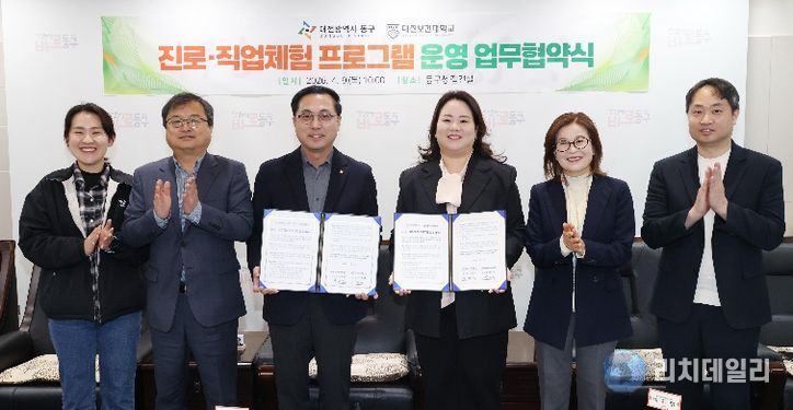리치데일리 김상현 기자 | 대전 동구는 9일 대전보건대학교(총장 이정화)와 지역 내 아동·청소년의 진로 역량 강화를 위한 ‘진로‧직업체험 프로그램 운영 업무협약’을 체결했다고 밝혔다.