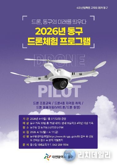 리치데일리 김상현 기자 | 대전 동구는 4월부터 오는 11월까지 구청과 동구 청소년자연수련원에서 ‘2026년 드론체험 프로그램’을 운영한다고 9일 밝혔다.