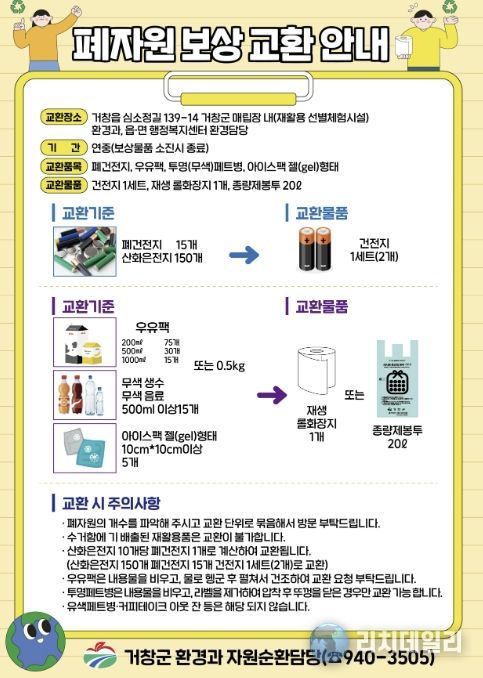 리치데일리 김상현 기자 | 거창군은 자원순환 실천과 올바른 분리배출 문화 정착을 위해 폐자원보상 교환 사업을 확대 시행한다고 9일 밝혔다.