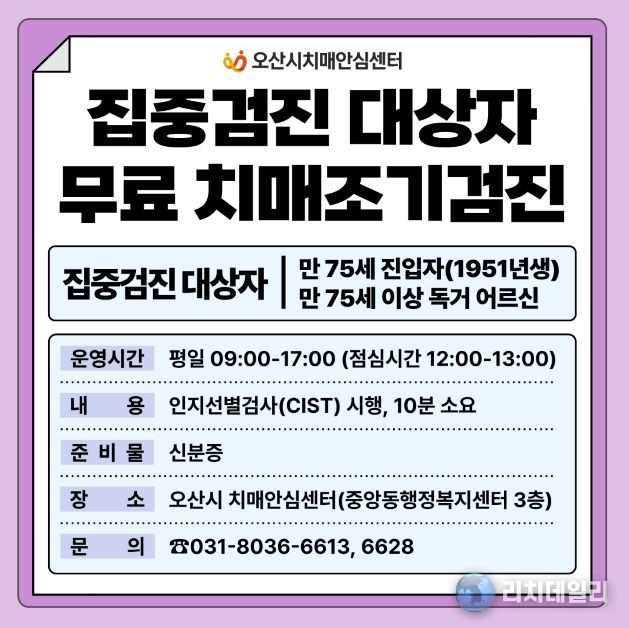 리치데일리 김상현 기자 | 오산시치매안심센터는 치매의 조기 발견과 예방적 관리를 위해 관내 만 75세 진입자(1951년생) 및 만 75세 이상 독거 어르신을 대상으로 치매 집중검진을 실시한다고 밝혔다.
