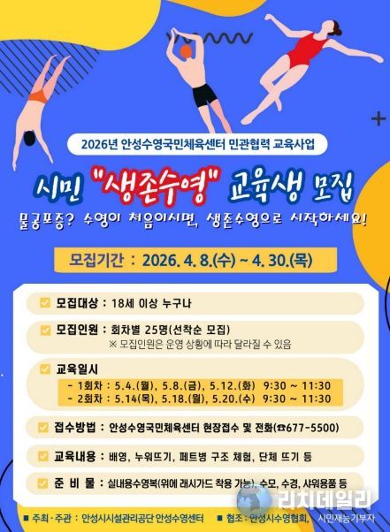 리치데일리 김상현 기자 | 안성시의 수상 안전망이 전 세대로 확대된다. 안성시시설관리공단이 운영하는 안성수영국민체육센터는 최근 증가하는 수상 사고에 대비해, 초등학생 중심이었던 생존수영 교육을 전 시민 대상으로 확대하는 ‘시민 생존수영교육 혁신사업’을 추진한다. 이번 사업은 공공 체육시설의 유휴 자원을 효율적으로 재배치해 시민들의 실전 생존기술 습득을 돕기 위해 마련됐다.