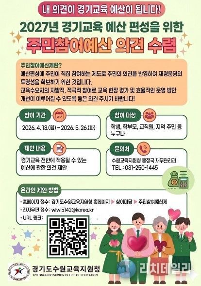 리치데일리 김상현 기자 | 경기도수원교육지원청은 4월 13일부터 5월 26일까지 2027년도 경기교육 예산 편성을 위한 주민참여예산 의견수렴을 실시한다.