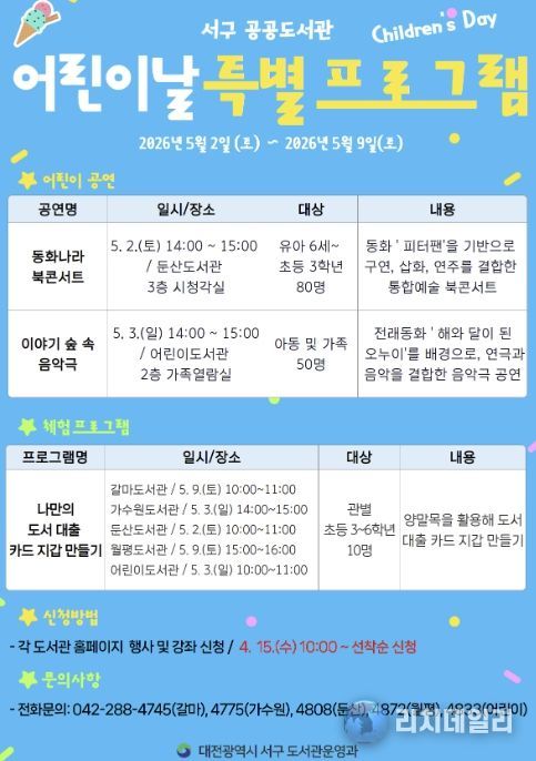 리치데일리 김상현 기자 | 대전 서구 갈마·가수원·둔산·월평·어린이도서관은 내달 2일부터‘어린이날 특별 프로그램’을 운영한다.