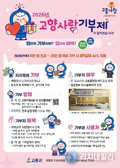 한편, 고향사랑기부제는 개인이 주소지를 제외한 다른 지방자치단체에 기부할 수 있는 제도로, 기부금에 대한 세액공제와 함께 지역 특산품 등 답례품을 제공받을 수 있다.