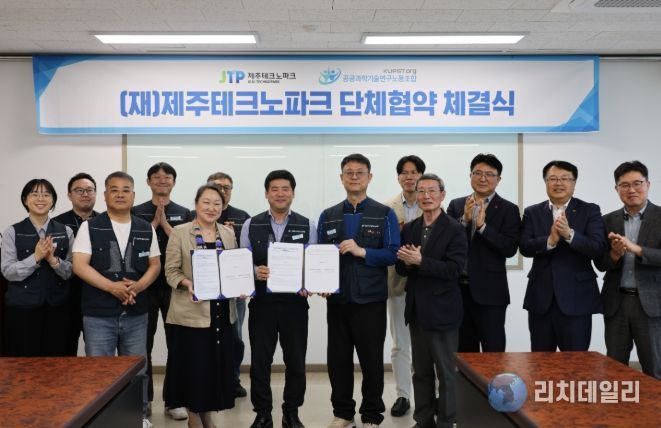 리치데일리 김상현 기자 | 제주테크노파크(원장 지영흔,제주TP)와 공공과학기술연구노동조합 제주TP지부(위원장 최연택, 지부장 권철만)이 화합과 신뢰를 바탕으로 한 ‘단체협약’을 체결하며, 상생적 노사관계 정착과 지역 혁신성장의 동반자로서 공동 발전을 다짐했다.