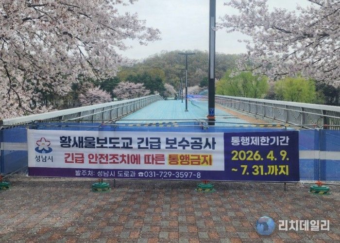 리치데일리 김상현 기자 | 성남시는 수내동 소재 탄천을 횡단하는 ‘황새울보도교’에서 구조적 결함인 슬래브 균열이 발견됨에 따라, 시민 안전을 확보하기 위해 4월 9일부터 교량 통행을 전면 금지한다고 밝혔다.