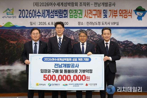 리치데일리 김상현 기자 | (재)2026여수세계섬박람회조직위원회는 4월 8일 전라남도청 도지사실에서 전남개발공사와 ‘2026여수세계섬박람회 입장권 구매약정식’을 갖고, 성공적인 행사 준비를 위한 협력에 나섰다.