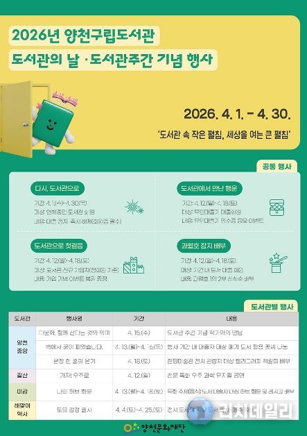 이번 행사는 ‘도서관 속 작은 펼침, 세상을 여는 큰 열림’을 주제로, 주민이 일상 속에서 자연스럽게 독서와 문화를 접할 수 있도록 기획됐다. 4월 한 달간 양천구 곳곳의 도서관에서는 다양한 이벤트와 도서관별 특색 있는 프로그램이 펼쳐질 예정이다.