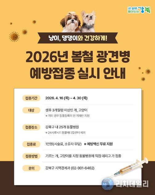 리치데일리 김상현 기자 | 서울 강북구는 반려동물과 구민의 건강을 보호하기 위해 4월 16일부터 30일까지 ‘2026년 봄철 광견병 예방접종’을 실시한다고 밝혔다.