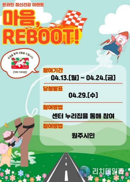 리치데일리 김상현 기자 | 원주시정신건강복지센터는 온라인 정신건강 이벤트‘마음, REBOOT’를 오는 4월 13일부터 4월 24일까지 진행한다.