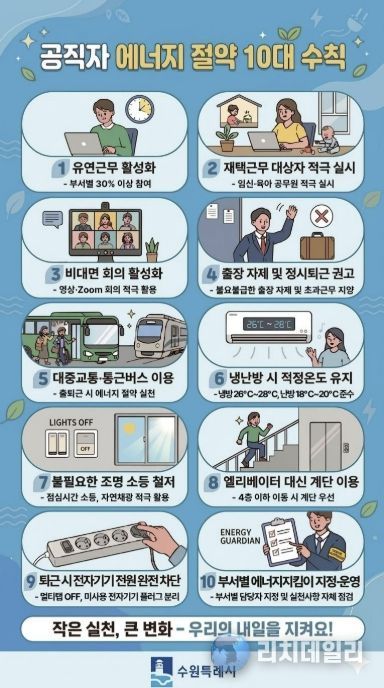 수원시는 ‘공직자 에너지 절약 10대 수칙’을 10일 행정포털에 게시해 공직자들에게 알리고, 13일부터 시행한다.