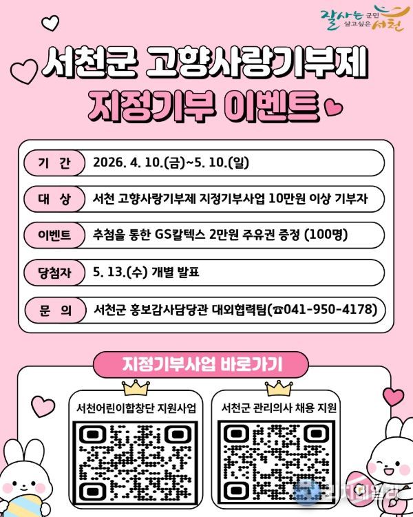 리치데일리 김상현 기자 | 서천군은 고향사랑기부제 지정기부사업 활성화와 기부 참여 확산을 위해 오는 4월 10일부터 5월 10일까지 지정기부사업 기부 이벤트를 추진한다.