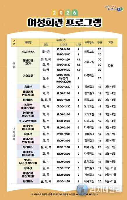 리치데일리 김상현 기자 | 충북 보은군은 오는 22일까지 ‘2026년 보은군 여성회관 2차 단기 교육과정’ 수강생을 선착순 모집한다고 밝혔다.