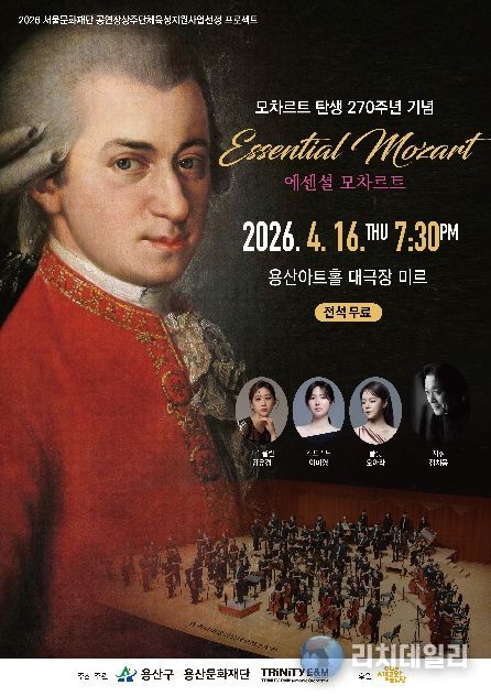 리치데일리 김상현 기자 | 서울 용산구가 오는 16일 오후 7시 30분, 용산아트홀 대극장 미르(녹사평대로 150, 지하 2층)에서 클래식 공연 ‘에센셜(Essential) 모차르트’를 개최한다. 구민의 문화예술 향유 기회를 확대하고 지역 문화의 활력을 높이기 위해 마련한 자리다.
